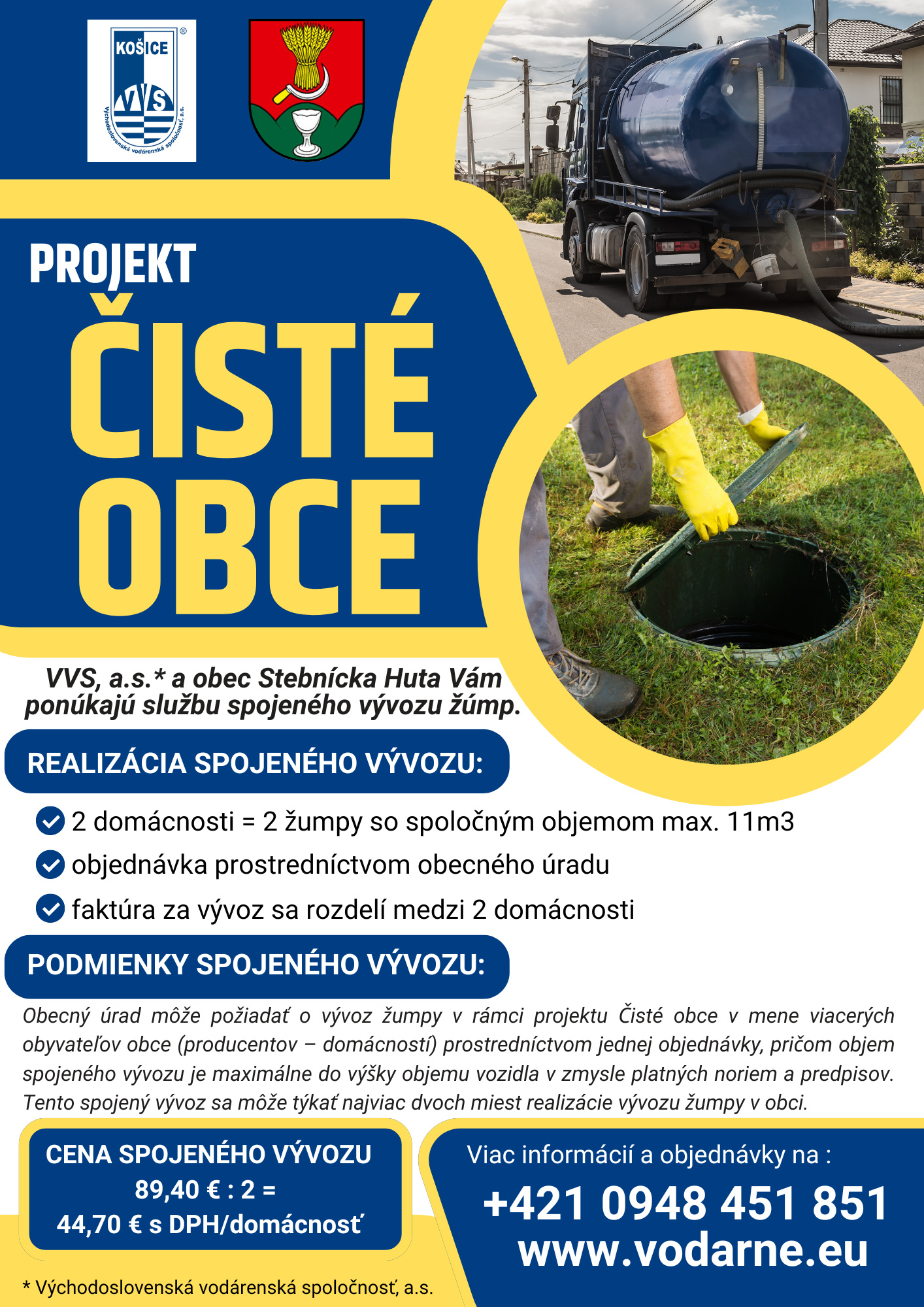 Východoslovenská vodárenská spoločnosť, a.s. a obec Stebnícka Huta Vám ponúkajú službu spojeného vývozu žúmp.